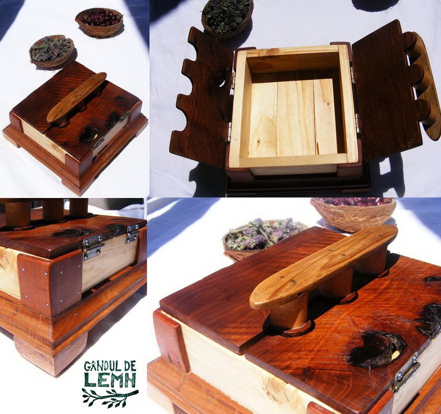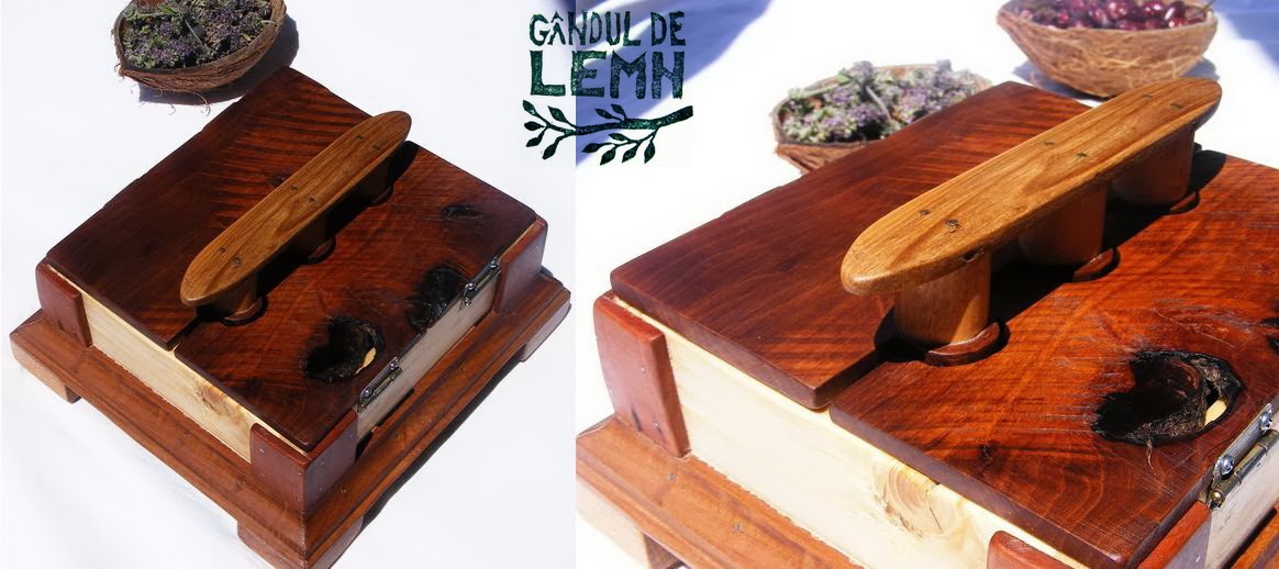 Finisajul este natural, cu mai multe straturi de ulei si ceara de albine, un procedeu care cere timp, insa lasa textura naturala a lemnului ramanand mat si cu un miros frumos. Dimensiuni: 19 * 20 cm laturile, inaltimea 9 cm.