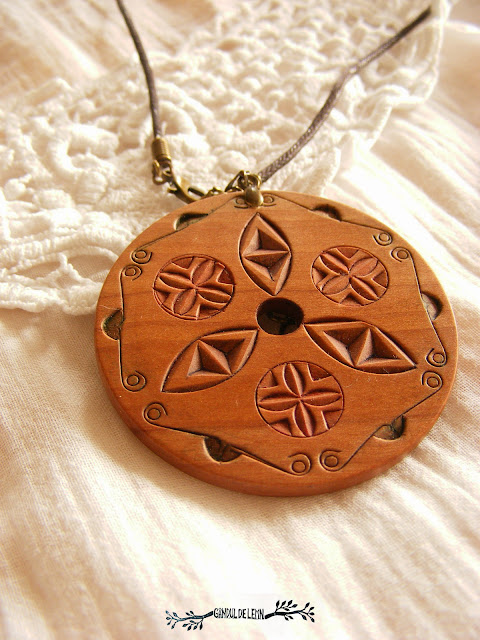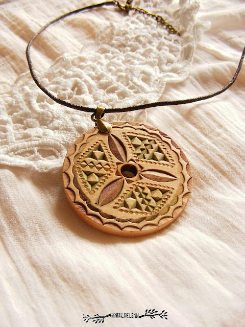 Colier/ lemn de păr sălbatic/ incizat/ crestat/ culori pastel/ accesorii bronz/ ulei de in/ diametru 5 cm/ lungime şnur bumbac 40 cm, plus prelungire 5 cm. Disponibile aici: Podoaba arhaica .